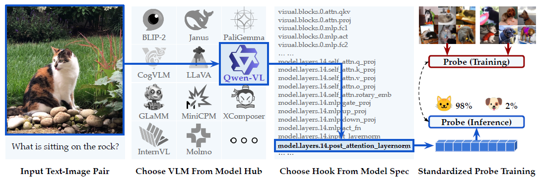 一个旨在通过支持从开源视觉-语言模型(VLM)前向传播过程中任何层提取中间输出来实现对视觉-语言模型的系统性基准测试、分析和解释的工具包。