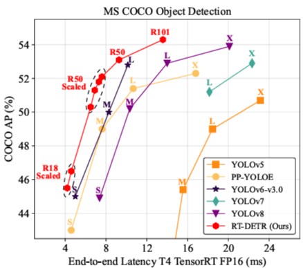 | RT-DETR-R101 | Advanced YOLOs | COCO | 54.3% | 74 | Outperforms YOLOs in both speed and accuracy. |